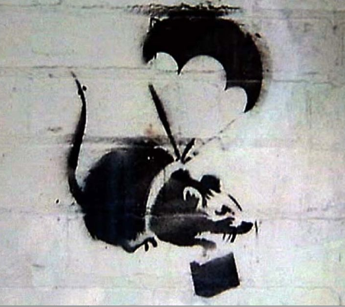 “Parachute Rat” by British artist, Banksy – before its destruction by the Local Authorities (Photo ABC TV)